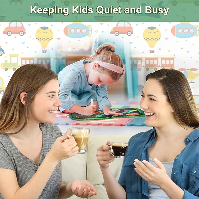 • 🎨Kid's Road Trip Essentials--Kids Erasable Graffiti Book has sticky buttons on the outside to keep it in place and a pens pocket on the inside for 12 watercolor pens. Even in cars, planes and other means of transportation, kids can draw as much as they want.
