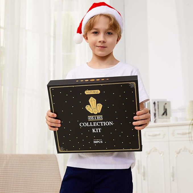 • Exquisite Rock Collection Kit Gift Box: A perfect rock collection kit for kids, This toolkit includes 30 pieces of natural rocks, gemstones and crystals, as well as a magnifying glass, Brushes and a full color learning guide.