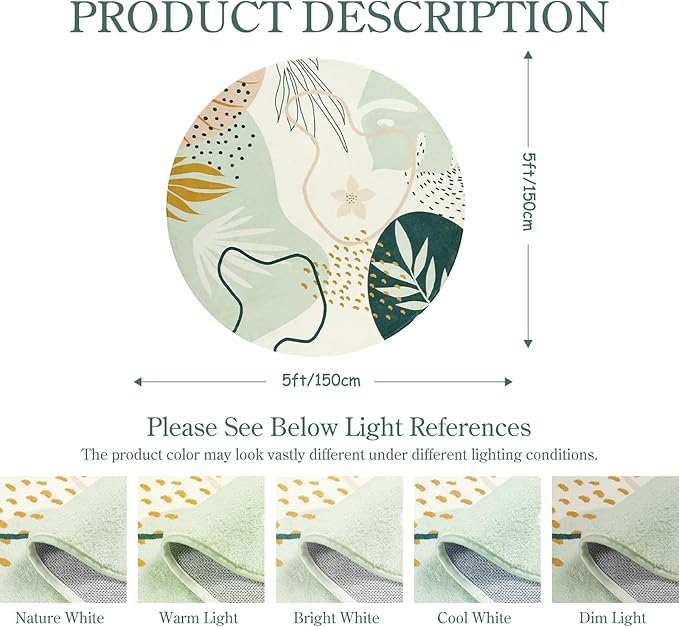Lahome Green Round Area Rugs 5Ft - Washable Large Boho Round Rug for Living Room Non-Slip Throw Circle Rug for Dining Room Table,Soft Cute Botanical Print Floor Mat Carpet for Bedroom Office Bathroom