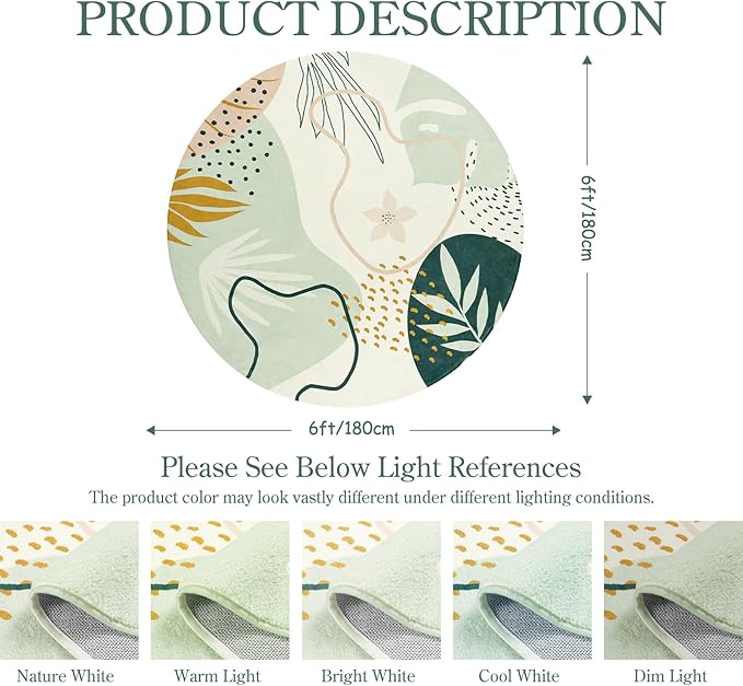 Lahome Green Washable Round Rug - 6Ft Round Area Rug for Living Room Throw Soft Boho Round Rug Large Non-Slip Round Dining Room Rug, Botanical Print Round Carpet for Bedroom Entryway Classroom Dorm