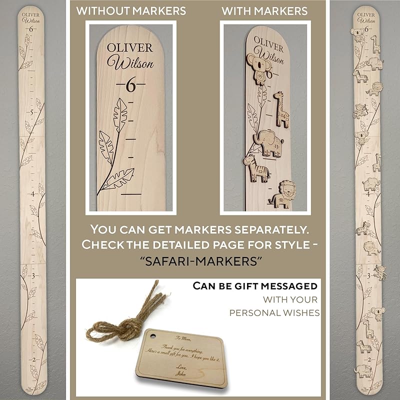 • Customizable: personalize animals growing chart with child's name or a short phrase like "watch me grow". If only one name is provided, it will be engraved in cursive by default (similar to 'Wilson' in the photos), unless other preferences are indicated. Elevate jungle theme kids room with this cute and customizable height chart, creating lasting memories as they measure their growth