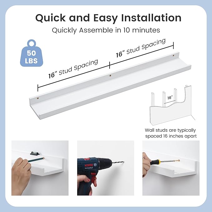 • Easy to Install: You will get a level, screws for the wall, drywall anchors, a detailed installation guide, and two beautiful hand-crafted solid pine wood shelves. With the level, you can make sure your picture ledge shelves are well aligned. Just follow the simple instruction to install the hanging shelves for wall decor within 10 minutes. We add additional screw and anchor to the hardware bag just in case. If you have any questions about our products, please feel free to contact us