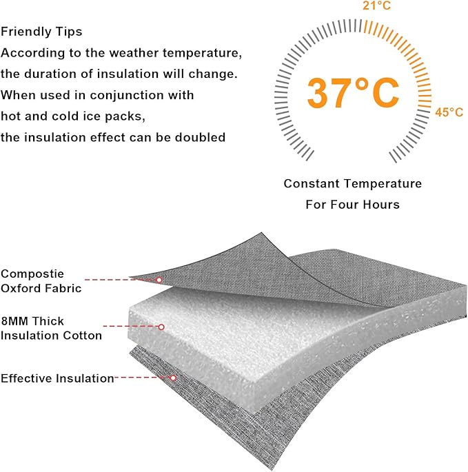 • MATERIALS: Made of water-resistant composite oxford fabric, 8mm extra-thick EPE foam and food-grade aluminum foil liner. Food safe, durable, lightweight. Effectively keep bottles stay cold, warm or fresh for hours, it keeps breast milk fresh.