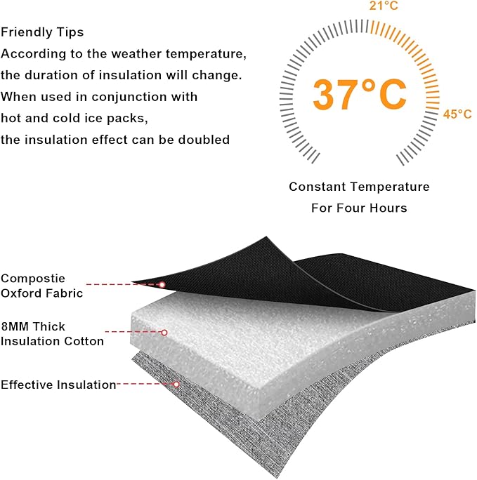 • MATERIALS: Made of water-resistant composite oxford fabric, 8mm extra-thick EPE foam and food-grade aluminum foil liner. Food safe, durable, lightweight. Effectively keep bottles stay cold, warm or fresh for hours, it keeps breast milk fresh.