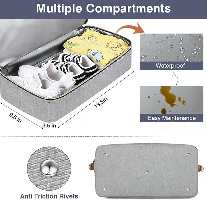• [Dry Wet Seperated Compartment] The compartment of this travel diaper bag is fashioned with PVC waterproof materials.This compartment can also be used to hold dirty clothes, shoes or wet towels, separating wet and dry to prevent your clean luggage from getting soiled or wet. Compartment size: 19.5*9.5*3.5in. Also studded 4 round metal feet in the bottom to keep the baby diaper bag clean and off the ground.