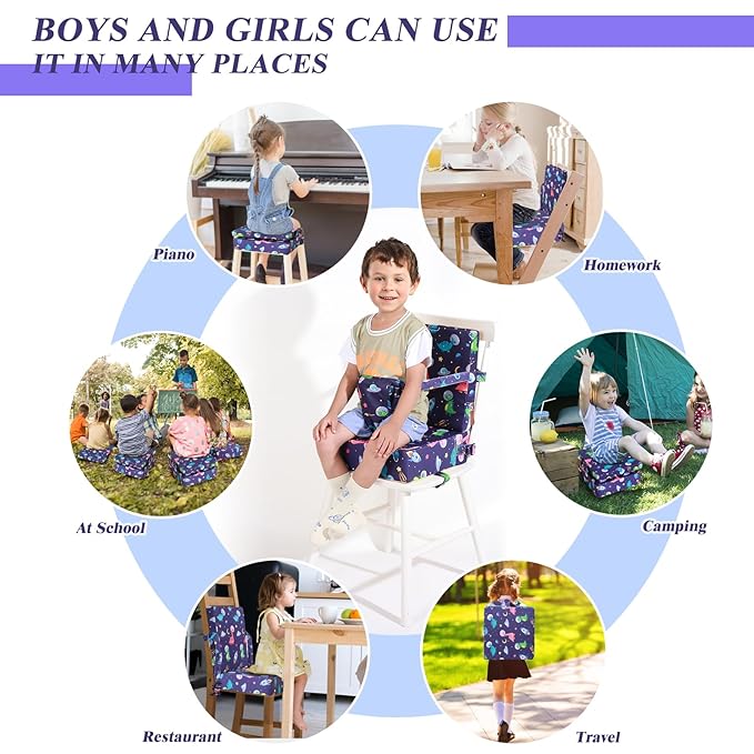 • [Perfect size] The portable booster seat has a backrest size of 14.1 x 12.6 x 1.57 inches and a cushion size of 14.1 x 12.6 x 4 inches, making our kids booster seat suitable for most dining chairs. We have also increased the length of the bottom seat belt to better secure the seat cushion to the chair. Note: Due to packaging compression, the product will return to its original height within 24-48 hours after opening