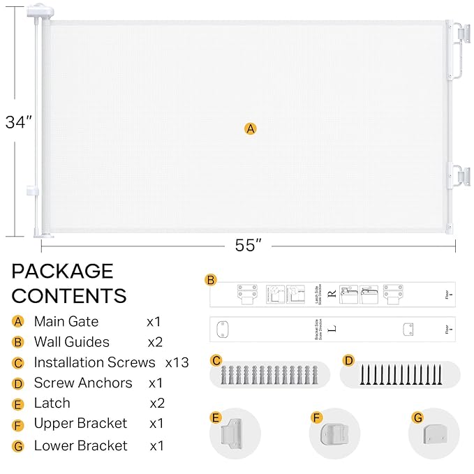 • Easy Hardware Installation: With the tools provided, you can have your new mesh retractable gate installed in minutes. Brackets, wall anchors, and screws make installation a hassle-free process. (Note: Not suitable for metal surfaces. When mounting to drywall, always anchor the screws into a stud for a secure and safe installation.)