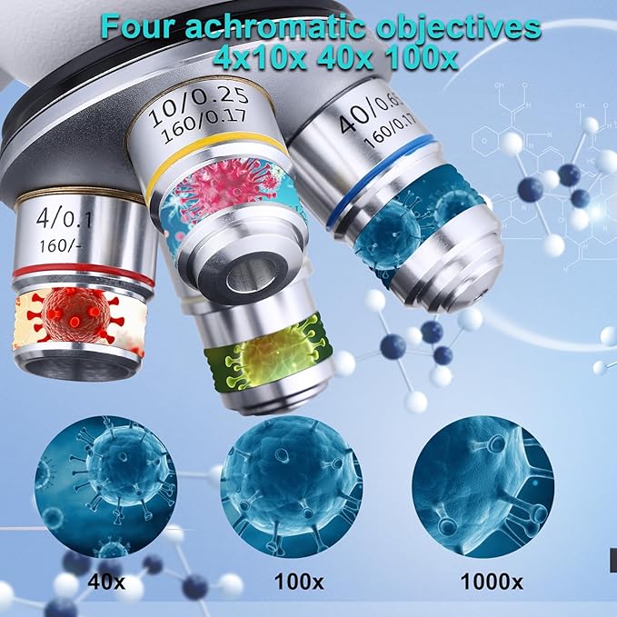 • Laboratory professional microscope: 195 flat-field achromatic objective lens can magnify up to 40X, 100X, 250X, 400X, 1000X and 5000X, high light transmission, better imaging effect of the microscope, clear and sharp, highly color reproduction