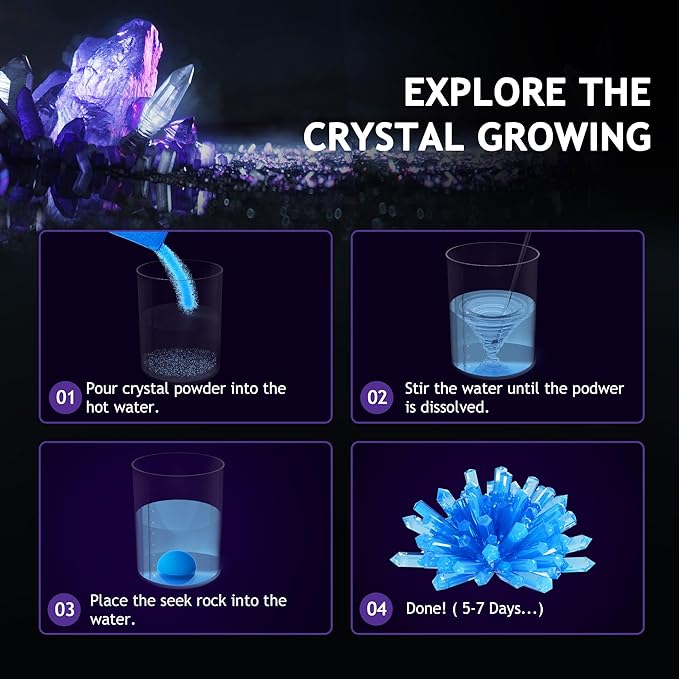 • IGNITE YOUR CHILD'S PASSION FOR SCIENCE: Unlock the hidden gemstone inside the rock with a satisfying tap, or marvel at the dazzling crystals inside the geode. There's nothing more thrilling in the world of geology. And that's not all - our stem toys also includes two packs of crystal powder to simulate the mesmerizing process of crystal growth. These magical discoveries and hands-on experiences allow kids to learn scientific knowledge and develop a passion for science, geology,and paleontology.