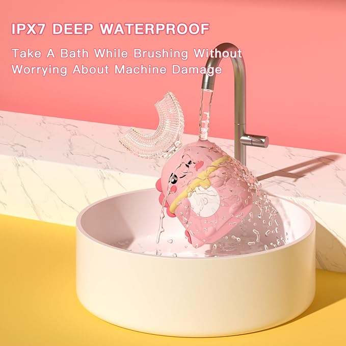 • Two Brush Heads Options: Kids electric toothbrushes provide two brush heads, food-grade silicone u-shaped brush head and soft brush head, U-shaped design is perfect for toddlers and children's teeth, soft silicone, providing a comfortable brushing sensation, thus developing healthy brushing habits, with the soft brush head for more efficient deep cleaning