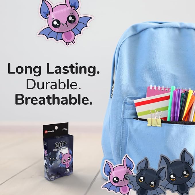 BioSwiss Bandages, Halloween Bat Shaped Self Adhesive Bandage, Latex Free Sterile Wound Care, Fun First Aid Kit Supplies for Kids, 24 Count