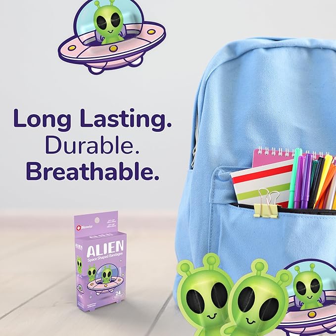 • ALIEN HALLOWEEN BANDAGES: This 24 piece pack of frightfully fun Halloween Alien bandages is great for putting a smile on kids' faces while protecting wounds such as cuts, scrapes, and burns, and come in 2 assorted styles; sticky bandages are perfect for kids and adults alike, and also for school nurses and pediatric doctors