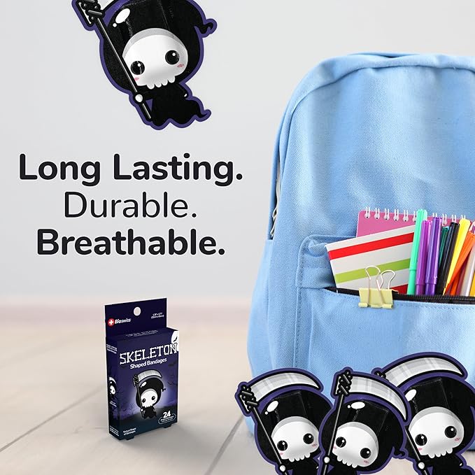 BioSwiss Bandages, Halloween Skeleton Shaped Self Adhesive Bandage, Latex Free Sterile Wound Care, Fun First Aid Kit Supplies for Kids, 24 Count