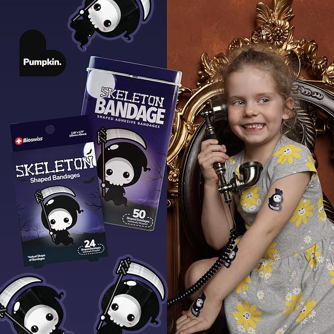• SKELETON HALLOWEEN BANDAGES: This 24 piece pack of frightfully fun Halloween Skeleton bandages is great for putting a smile on kids' faces while protecting wounds such as cuts, scrapes, and burns; sticky bandages are perfect for kids and adults alike, and also for school nurses and pediatric doctors