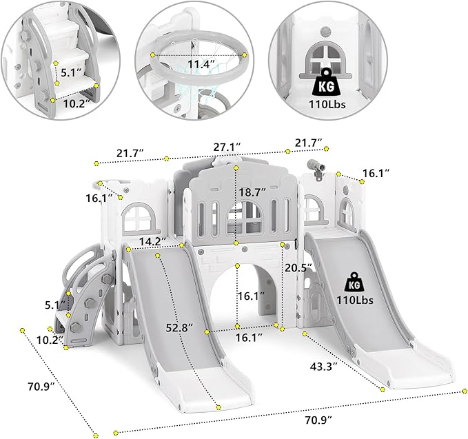 • 【9-in-1 Multifunctional Playset】JOYLDIAS 9 in 1 toddler slide set has 9 activity areas, including double 2 slides, basketball hoop, storage space and non-slip enclosed step, widened climbing ladder, crawl-through tunnel and telescope. It can exercise children's muscle strength, balance and coordination and make the reaction more agile. And add baby's fun during the play.