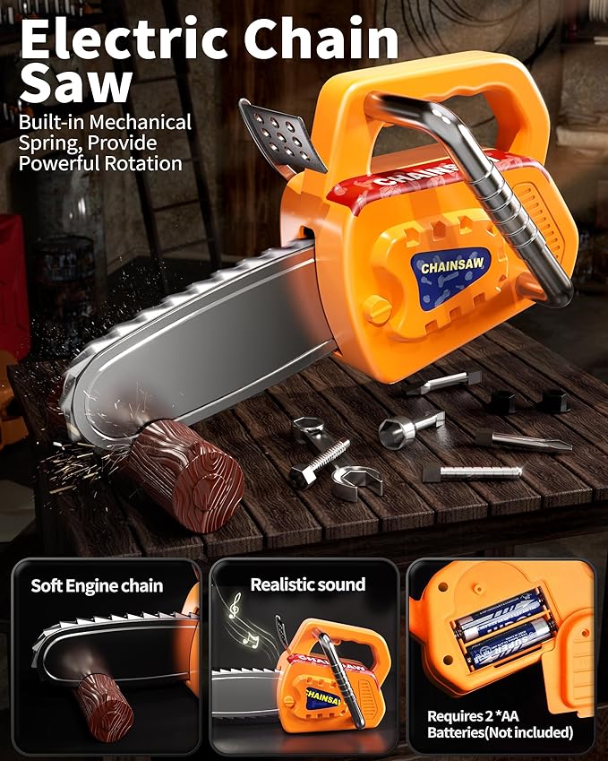 • 【Electric Saws & Drills】The chain of a toy chainsaw rotates at a uniform speed, which is safe for children! The toys drill comes with 4 interchangeable drill bits for different functions, it only requires 2AA batteries that simulate sound and movements, which is more attractive and develop kids' imagination.
