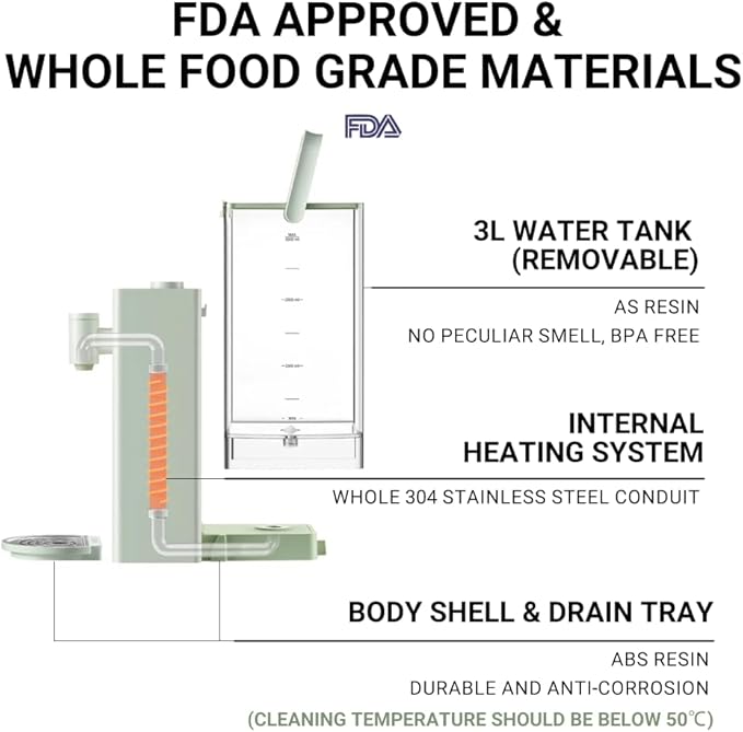 • HEALTHY MATERIALS & SAFETY CHILD LOCK - S9013 water dispenser has passed the FDA food grade test, every cup of water is safe for drinking. 3L water tank, body shell, draining tray are made of food grade AS, ABS resin, BPA free, durable and anti-corrosion; internal heating system is made of food grade 304 stainless steel conduit, ensuring water security. Safe child lock design can effectively ensure safety of children and pets at home.