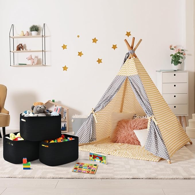 Storage Basket,Woven Baskets for Storage,Cotton Rope Baskets for Organizing,decorative Baskets for Shelves,book Basket,towel Basket,Toy Basket or Storage Bins for Living Room - 3 Pack,Black