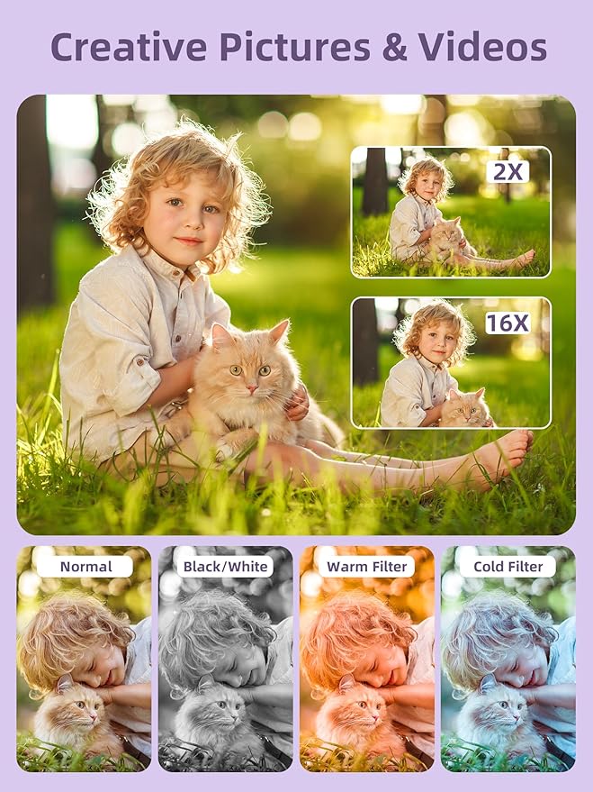 • ENCOURAGE CREATIVE - If you are tired of its automatic results, the point and shoot camera allows you to customize pictures. 16X zoom is great for photographing objects in the distance. 20 pcs creative filter effects to take Vintage photos, Black/White photos..., Anti shake, webcam, face and smile detection, continuous shooting, self-timer, waiting for you to explore them.