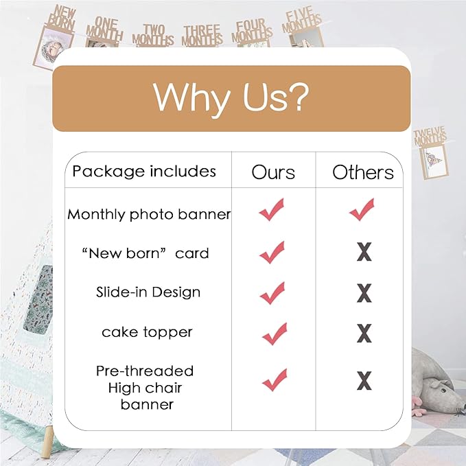 • Why Us: First all, a lot of sellers use glue to stick the photos to the banner, which is easy to fall off and damage your precious photos; Second, they don't include the "NEWBORN" card and we have; The last, many of them only sell the monthly photo banner at the same price, but we offer more! The "One" high chair banner and "One" cake topper are cherries on the top, to make your baby birthday a bit more beautiful!
