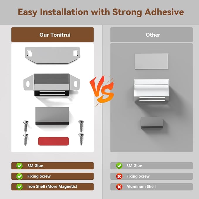• Strong Adhesive and Easy to Install: cabinet magnet Come with powerful adhesive stickers, which can firmly secure our magnet, it can be easily installed without the use of screws and tools. Adhesive installation and Flat bottom can also be used on metal glass and marble surface doors without damaging your exquisite furniture.