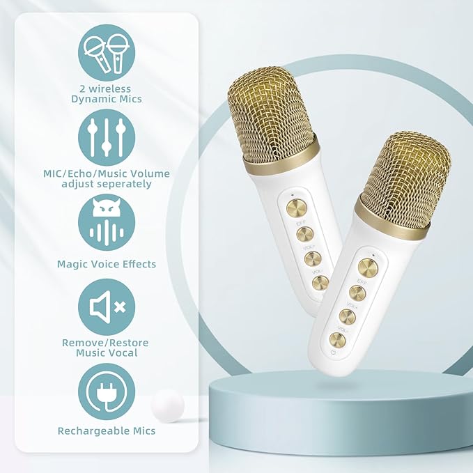 • ♪ 🎤【2 Interesting Microphones】Our mini karaoke microphones have seven kinds of magic voice effects: original, monster, baby, female, male, and 2 mixing, which can meet more needs and bring more fun. The voice changer microphone is perfect for in-car karaoke, home party, classroom, speeches, and many other occasions.