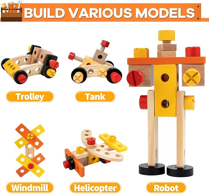 • 🎁【2-IN-1 DESIGN】This wooden tool kit can be transformed to make a workbench where kids exercise pounding, twisting, sawing, etc, and can also be folded up to keep all the tools and accessories inside for easy storage and carrying.