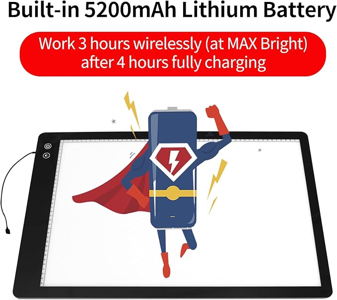 • 【 Built-in 5200mAh Battery 】 Our Upgraded Rechargeable A2 LED lightbox comes with a 5200mAh internal battery which allows you to use it any where without any power source, which makes your project more convenient as well as more enjoyable! Works for around 3 hours at MAX brightness after fully charged 4 hours at a time. This A2 lightpad uses a USB-C interface to easily access any USB port, such as a USB wall charger, computer, laptop or mobile power bank.