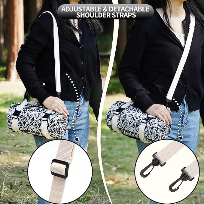 • ADJUSTABLE SHOULDER STRAPS - The portable picnic blanket can be carried easily by hand, on either shoulder by adjusting to the proper lengths, so you can carry other picnic suppliers with the other hand,the handle strap with double ring buckle is convenient to carry, and can easily fold and fix the picnic mat,so if you don't fold it exactly as originally packed, it will fit anyway,saving a lot of space on the travel.