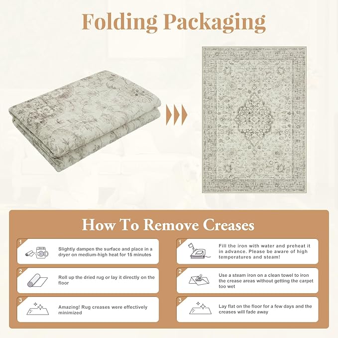 • Folding Packaging--Due to the folding during packaging, the taupe area rug may have some creases upon opening. However, the edges are resistant to buckling, and the folds will disappear once the rug is laid flat and ironed.