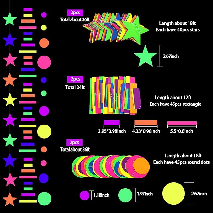 • 【What you can get】Package Include: 604Ft/6 Rolls long Fluorescent streamers (6 colors in total);36Ft/2pcs Round dot neon paper garland; 36Ft/2pcs Five-pointed Star neon garland; 24Ft/2pcs Rectangle Glow Strip; which is sufficient for glow in the dark party supplies.