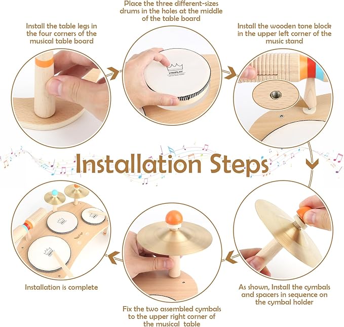 • Natural Wood & Smooth Surfaces: Our baby drum set is made of eco-friendly & natural wood material with environmental water-based paint, and CPC, CE are approved.