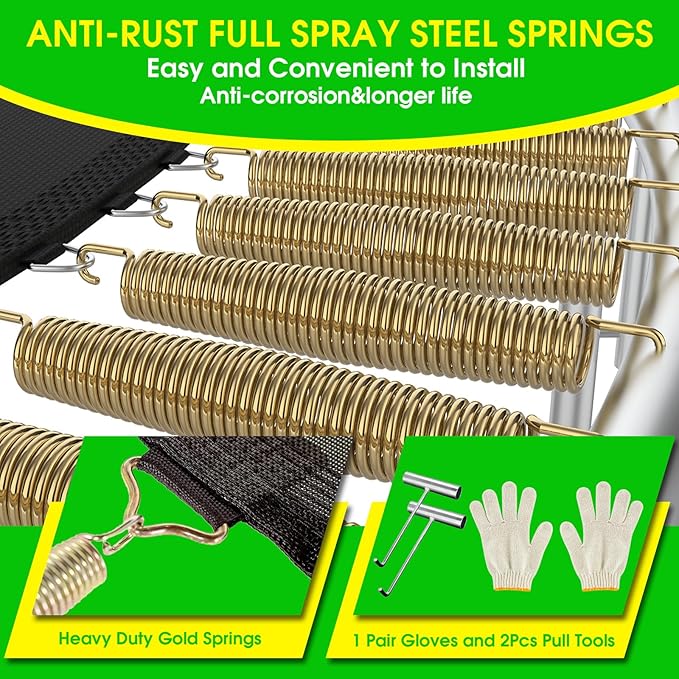 • 🌼Easy To Assemble In 1 Hour: The trampoline can be installed by 2 adults in 1-2 hours according to our detailed graphic manual. All parts and installation steps are listed and numbered. Spring tools are furnished in the package. 100% sense of achievement during assembling trampoline. New design trampoline is definitely the best gift for kids - jump higher, grow faster, stay away from electronics; burn off kids' energy, and let you enjoy your own time.