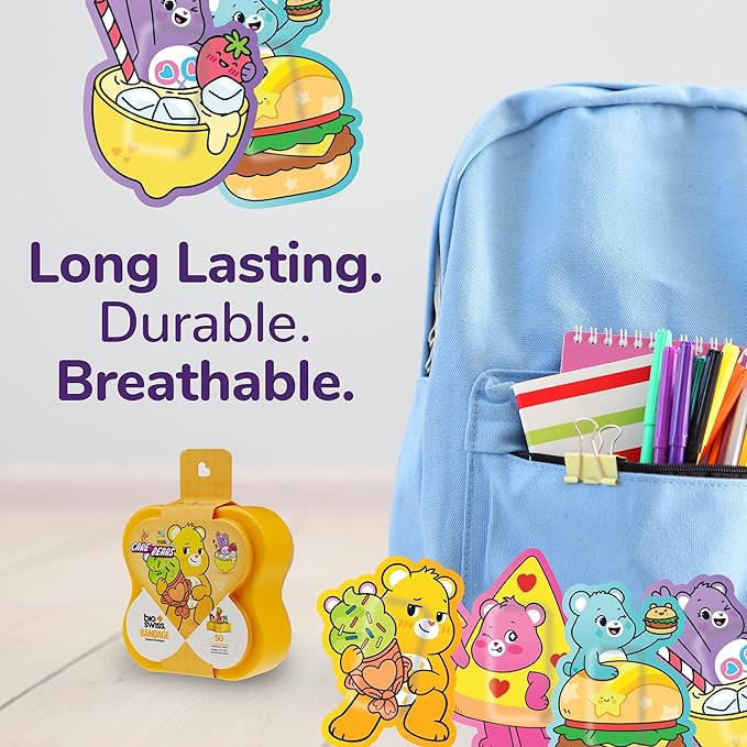 • CARE BEARS BANDAGES: This 50 piece pack of Care Bears bandages feature fun Wish Bear, Funshine Bear, Share Bear, and Cheer Bear shapes, and is great for putting a smile on kids' faces while protecting wounds such as cuts, scrapes, and burns; sticky bandages come in a cute plastic container and are perfect for kids and adults alike, and also for school nurses and pediatric doctors