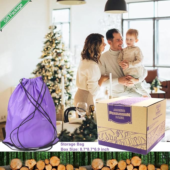 • 🎵.7 Types Percussion Set :1* Bongo Drum(Hand-held Drum). 1* Tambourine- 8 inch . 1* Big size Wood Tone Block and Guiro with Mallet. 1*Egg Shaker.1*Castanet with Thumb Handle. 1*Jingles Tap.2* Sleigh Bell. 1* Storage Bag. The sounds of all kinds of natural music stimulate children's interest in music.