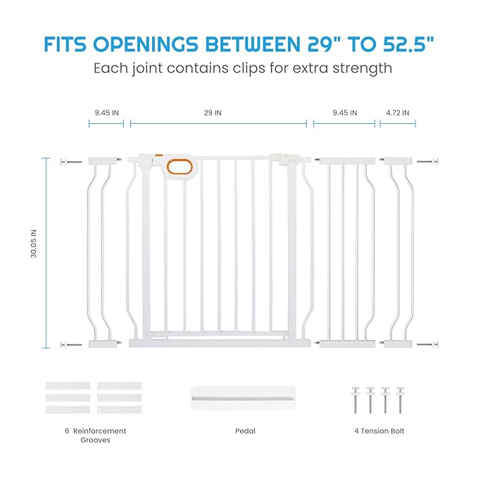 • 【Adjustable Width】This white baby gate features a rectangular design, with 2 x 4.7'' and 1 x 9.4 '' extensions included in the packaging. The height of 30.5 inches and the adjustable width of 29-52.5 inches ensures that your baby or pet is away from danger.