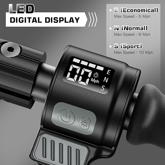 • 【🛴New Generation LED Display】The kids electric scooter E35 is equipped with an LED display that clearly shows riding speed mode, real-time speed, and battery level. 3 speed modes: 5 MPH for beginners and 8 MPH/10 MPH for advanced players (varies depending on usage and environment). This electric scooter for kids ages 8-12 ensures a smooth and controlled ride.