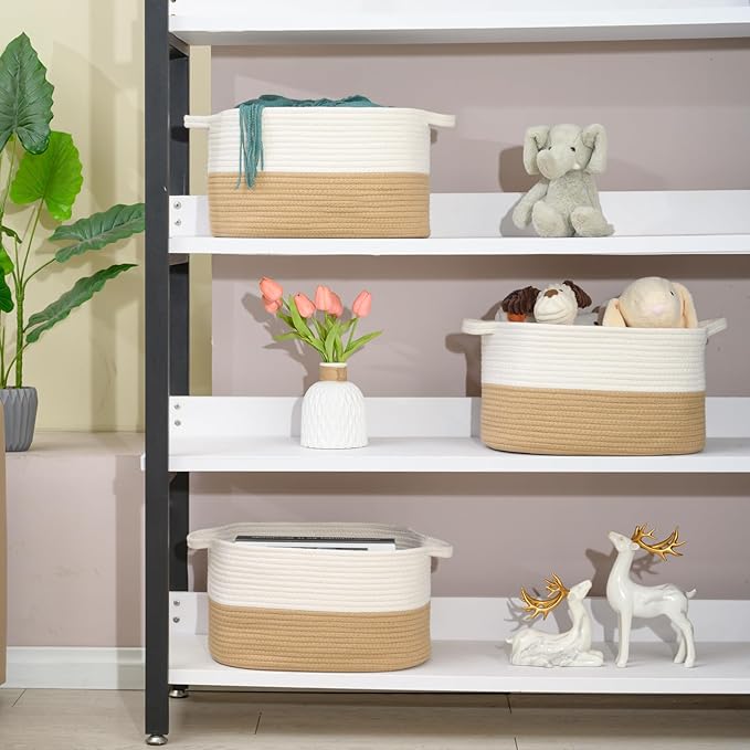 • 【Specifications】The baby basket is a two-color matching storage basket, 3-piece set. The baskets for organizing has two handles and is woven with cotton rope. Storage baskets size (length, width and height) is 15x10x8.7 inches, the size is moderate, belongs to the medium storage basket.