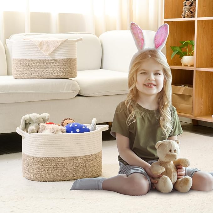 • 【Applicable】The woven basket can store children's products,such as children's toys,baby diapers,baby clothes,baby laundry basket,snacks,books,blankets,towels,and other baby products.It is the perfect storage basket for living rooms,bedrooms,bathrooms,baby rooms,miscellaneous rooms,playrooms,daycare centers,classrooms,offices,warehouses,and storage rooms.The rope basket can also be used as a basket for home storage, organizing clothes and shelves,making your room cleaner and tidier.