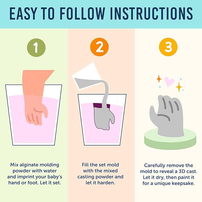 • Mess Free Casting Process: Mix the alginate molding powder with water to form a detailed mold of your baby's hand or foot. Fill with mixed casting powder, allow it to harden, and reveal a 3D cast ready for personalization with paint