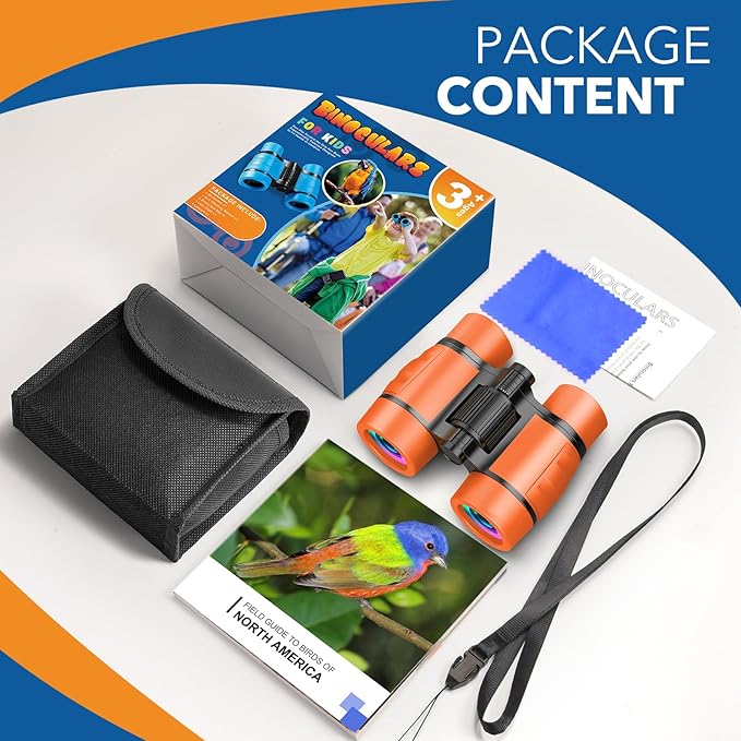 • Adventure Accessories: This fun binoculars is a perfect tool for your kid's outdoor adventure! Package Includs 1x 4x30 Binoculars, 1x Bird Watching Manual, 1x Carrying Canvas Bag, 1x Neck Strap, 1x Lens Wiping Cloth