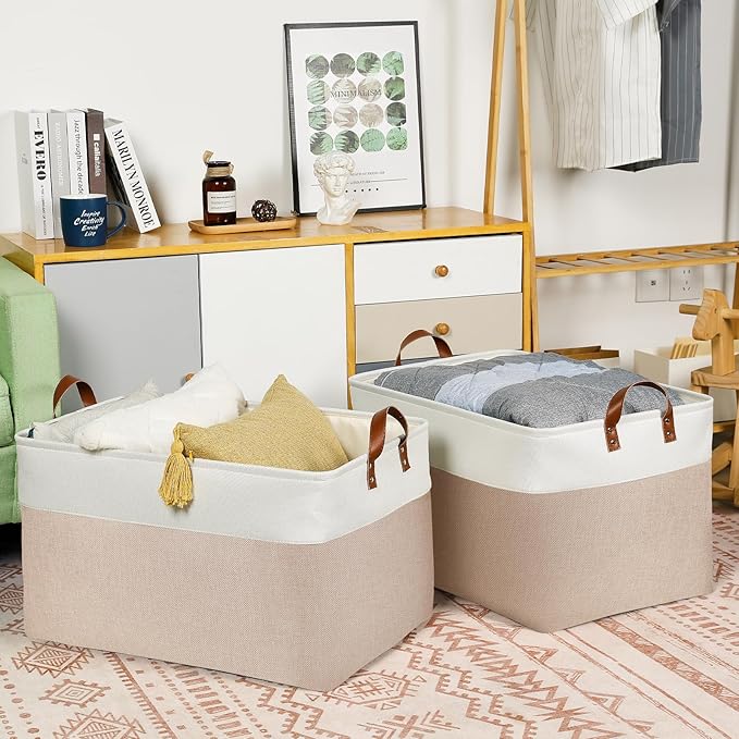 • 【Unique Design & Modern & Decorative】Set of 2 large storage baskets, dimensions(each): 22(L) x 15(W) x 13(H) inches. Fabric baskets for organizing bring you organizing convenience and a sweet home. Great for socks, underwear, books, magazines, toys, baby clothes, pet products, wipes, towels, decorations, office supplies, DVDs, and gifts. The Large Fabric baskets with neutral colors can match a lot of home styles - keeping your home nice and tidy.