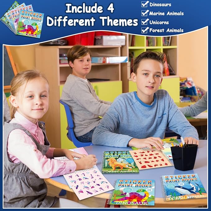 • 【Sticker Paint Books for Kids】Paint by sticker set consists of 4 books for kids 4-8, each containing 8 pages of unique images. In total, there are 32 pictures for you to complete. The book themes encompass dinosaurs, marine animals, forest animals, and unicorns. With a diverse range of themes and an abundant supply of stickers, this set is guaranteed to fulfill all your creative requirements.