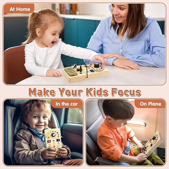 • [High Quality] Our fidget Board is made of eco-wood, smooth product edges and perfect size for the toddlers little hands. Soft light will not hurt the eyes of children and Inside the busy board is a professional circuit board, durable and safe.