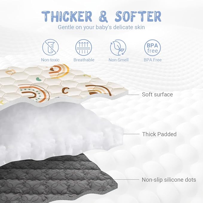 • 【Space to Play】This 71x59 baby play mat gives your little one plenty of space to crawl, roll, and play. Whether engaging in solo play or sharing the mat with siblings, they'll always have enough room. baby playmats are made of soft microfiber with a thickened finish for extra cushioning and comfort, provides safe place for your child to romp around.
