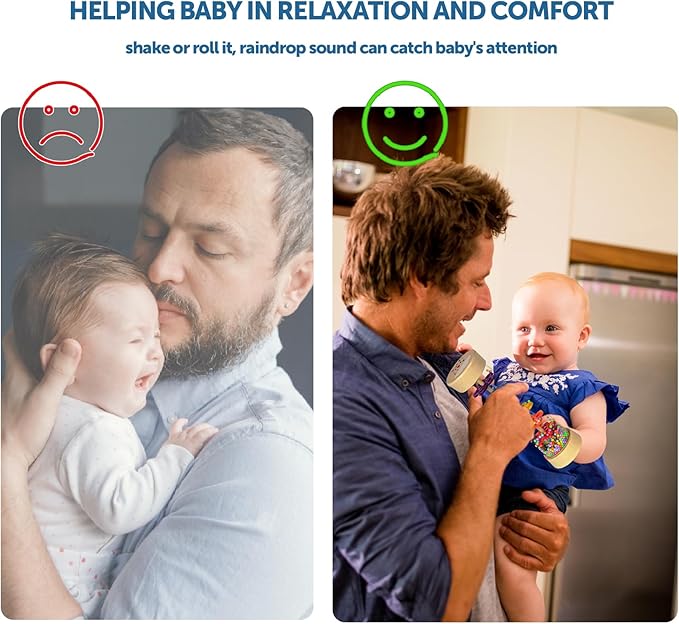 • 【Soothing Raindrop Sounds】: Turn this rain stick over, shake it or roll it around to produce clear and soothing sound of rain sounds. Raindrop sound can capture baby's attention, assisting our baby in relaxation and comfort, especially during moments of anxiety or unease