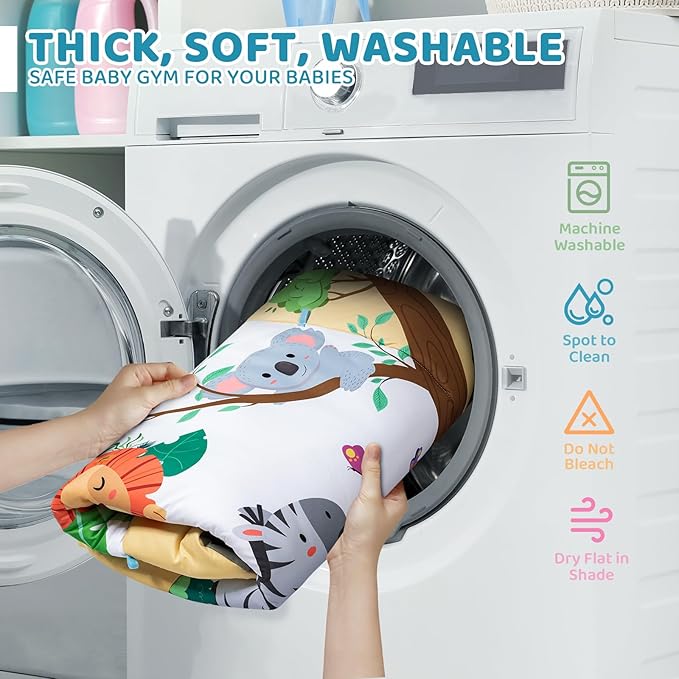 • Soft, Safe, and Washable - The baby gym play mat is made from high-quality fabrics, thick, delicate, and smooth touch, safe and comfortable for baby skins. Machine washable, easy to clean and keep hygienic. The tummy time activity mat can also be used directly on the floor, providing cushioning and protection for the baby. The balance of flatness and softness makes it more stable for babies to sit, stand and crawl.