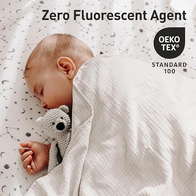 • SUITABLE SIZE: All of our products have passed the OEKO-TEX STANDARD 100 certification.Our muslin baby blanket measures 38'' x 40''(95 x 100 cm; material is approximately ± 1 inch), which is large enough to easily wrap or swaddle babies from startling themselves awake with random arm movements, recreates the secure and cozy feeling of the womb, helping soothe your baby and enabling them to sleep better