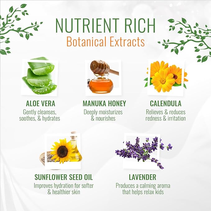 • NATURALLY NOURISHING ECZEMA WASH FOR KIDS - Made with manuka honey, sunflower seed oil, and soothing botanicals, this eczema body wash for babies support soft, healthy-feeling skin from head to toe.