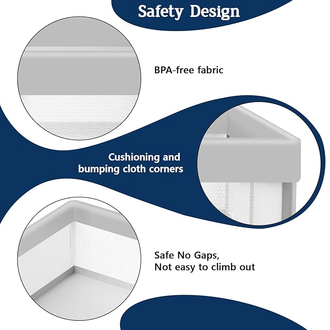 • 360 ° Visual Design-The side of baby fence feature is 360 ° visible,breathable mesh fabric. it allows you to keep an eye on your child at all times ,and lets them see you,ensure you and your baby get immense sense and comfort.